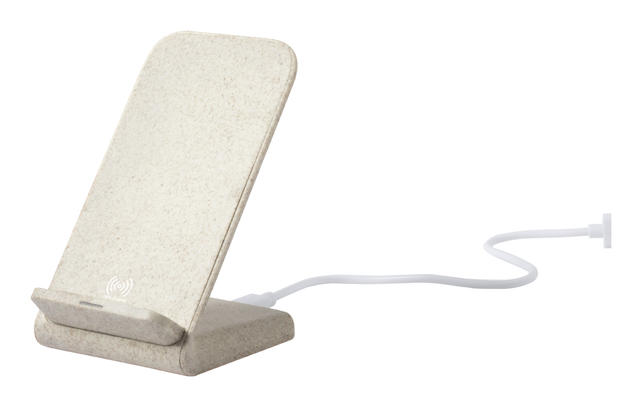 Ekološki plastični stolni držač za mobitel od pšenične slame s ugrađenim bežičnim brzim punjačem. Maksimalni izlaz 2000 mA. Uključujući USB kabel za punjenje.