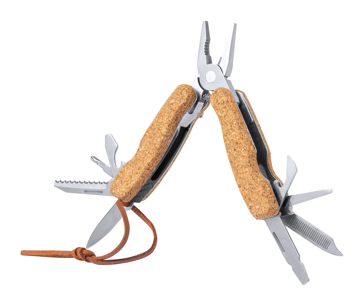 Višenamenski alat od nehrđajućeg čelika s ručkama od prirodnog pluta i 12 funkcija. S remenom za nošenje od PU kože.