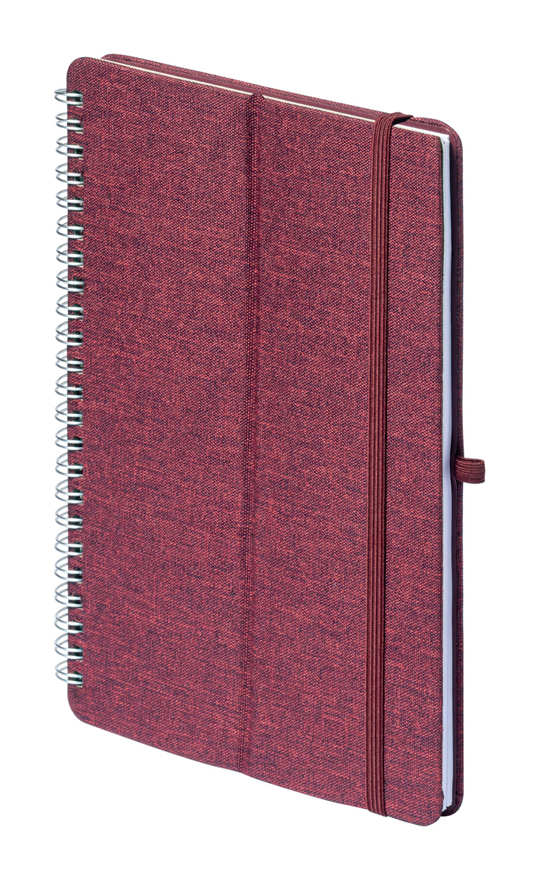 Spiralna bilježnica presvučena poliesterom 600D RPET s plastičnim mobitelom od pšenične slame i umetkom za stolni držač. Sa 70 crtanih listova i gumenim remenom. Veličina A5.