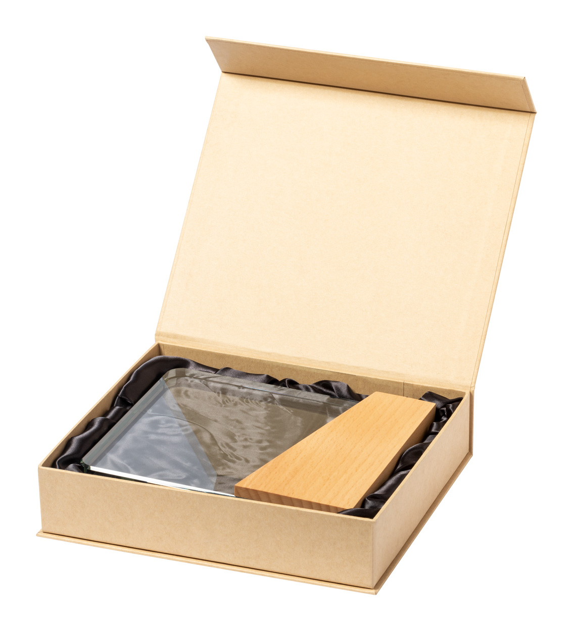 Stakleni trofej s drvenom bazom. U poklon kutiji od kraft papira.